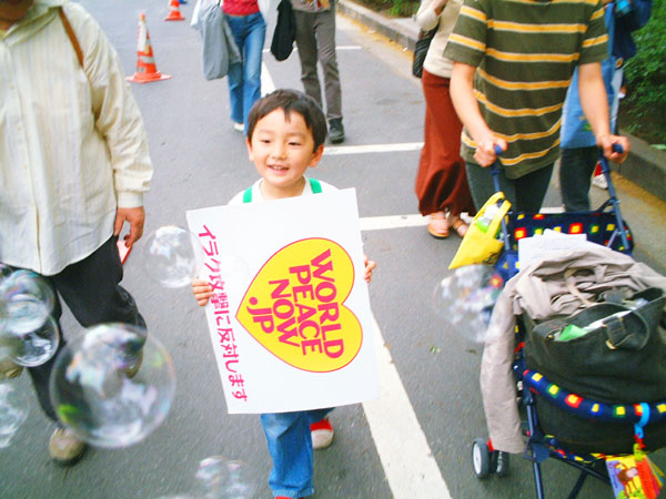 ■内容 デモでシャボン玉を飛ばす。 道具はこちらで用意します。 ■日時場所 2003/4/19@代々木公園ケヤキ並木(渋谷公会堂付近) ■コンセプト そもそも、デモに参加する時点で意思表明など出来ているので、あえて「戦争反対」などと言う必要もないです。よりデモを効果的に発展させるには、少々場違いな要素を加えて場の活性化をはかることに狙いがあります。 またシャボン玉自体は何も意図や意味するものも持ち合わせません、しかしデモの方から静かにそして広範囲に吹き乱れるシャボン玉は反戦を唱える意味を持ち合わすことでしょう。シャボン玉が吹き乱れるその場所は美しいインスタレーションとして見る側に機能します。(やまうち) ■関連リンク Tokyo Oujapan 4/20 そうそう、今日、表参道でしゃぼん玉2つ見ました。あの風の中、割れずにずいぶん前の方から流れて来たのだと思う。頭上に来る遙か手前で消えたけれど。どこから吹かれたのかは見えなかったけれど、なんかね、あのしゃぼん玉見た時、あっ!うわっ!と思った。とても良い感情だった。 逃げろや逃げろ!すべてのエルサレムから逃げろ! /2003年04月19日(土) ワカモノノゲンザイ